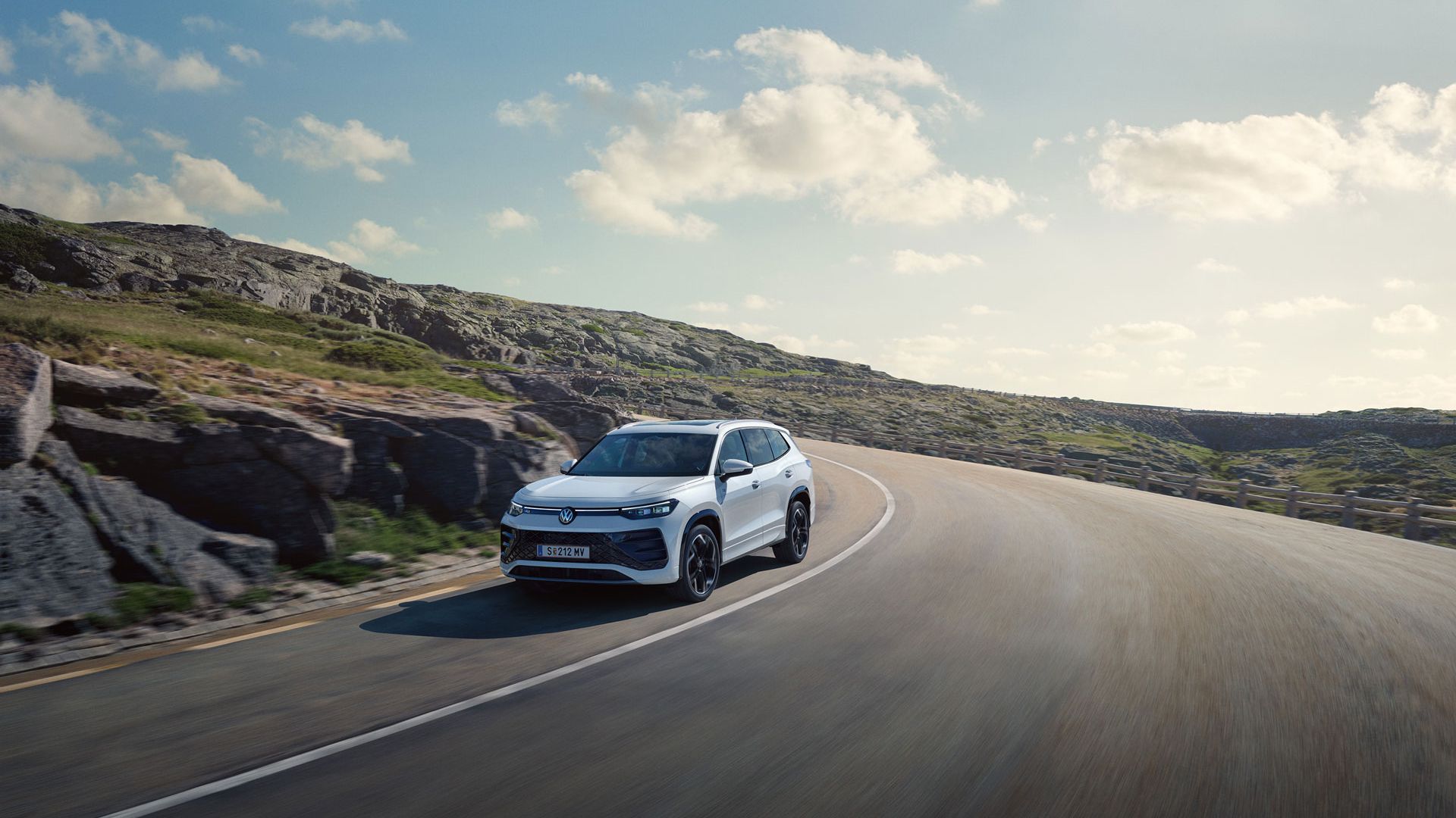 Volkswagen Tayron в бяло на живописен планински път под синьо небе