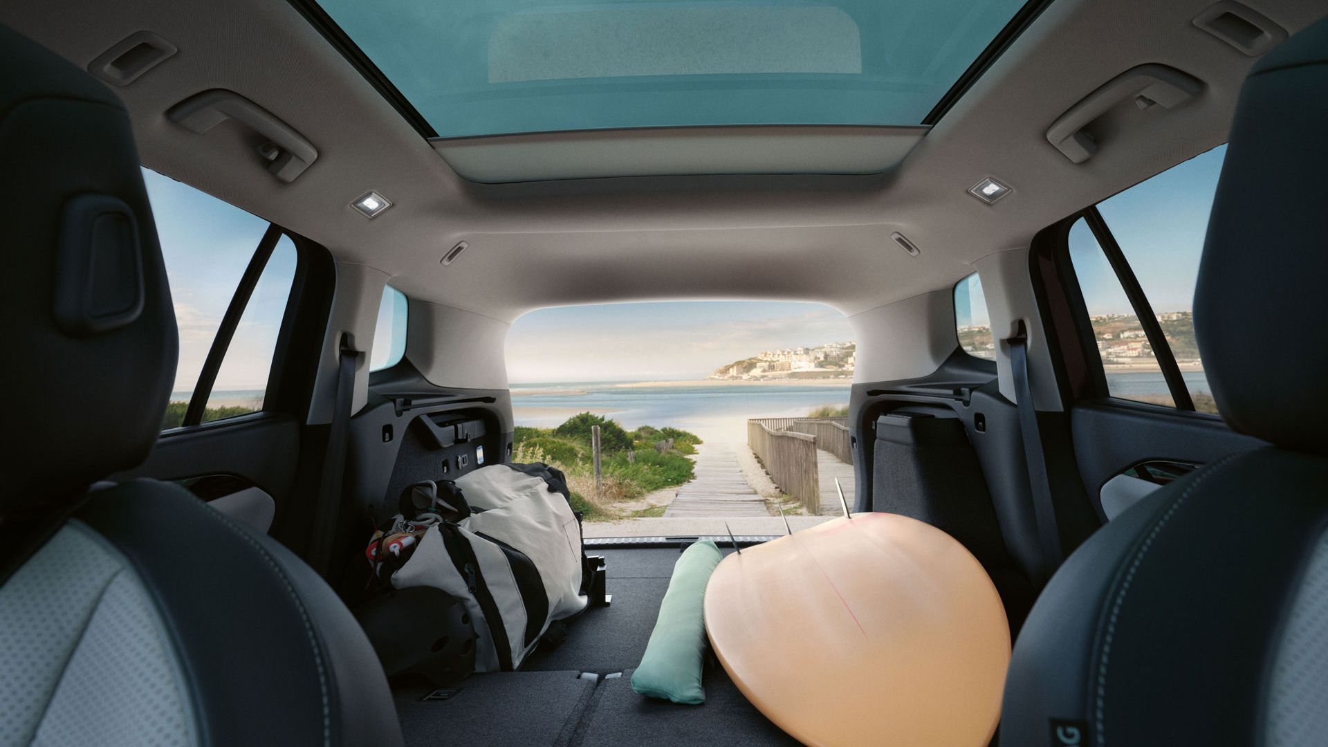 Просторно багажно отделение на новия Volkswagen Tayron с панорамен покрив и гледка към морето