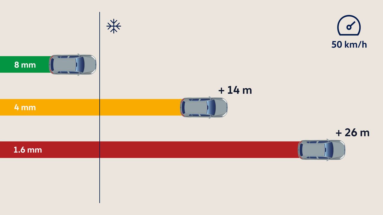 Колкото по-дълбок е протекторът на гумите, толкова по-ефективно отвеждат водата и предпазват от възникване на аквапланинг. Още при дълбочина на протектора под 4 мм гумата има значително по-слабо сцепление върху мокра настилка. Причината е, че протекторът вече не може ефективно да отвежда водата, и гумата губи контакт с пътната настилка.