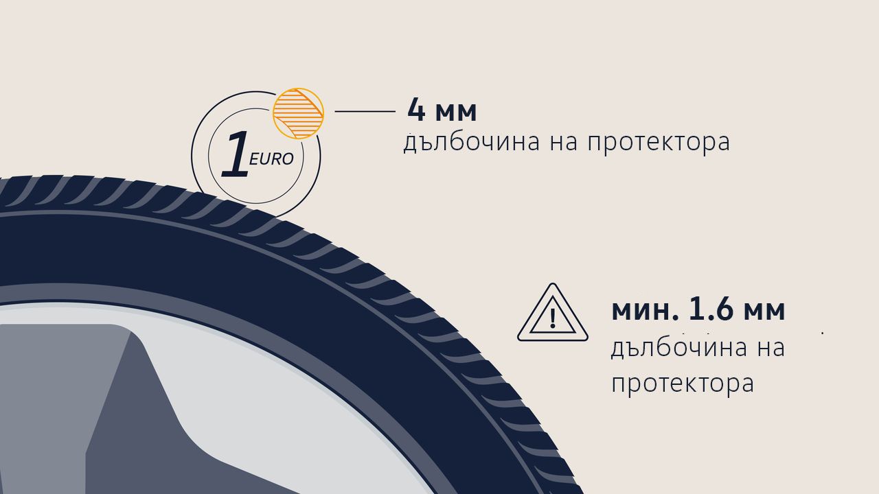 Този тест служи само като бърза ориентировъчна проверка и не заменя точно измерване. Не забравяйте, че законовата минимална дълбочина на протектора при зимните гуми в България е 4 мм, а при летни – минимум 1,6 мм.