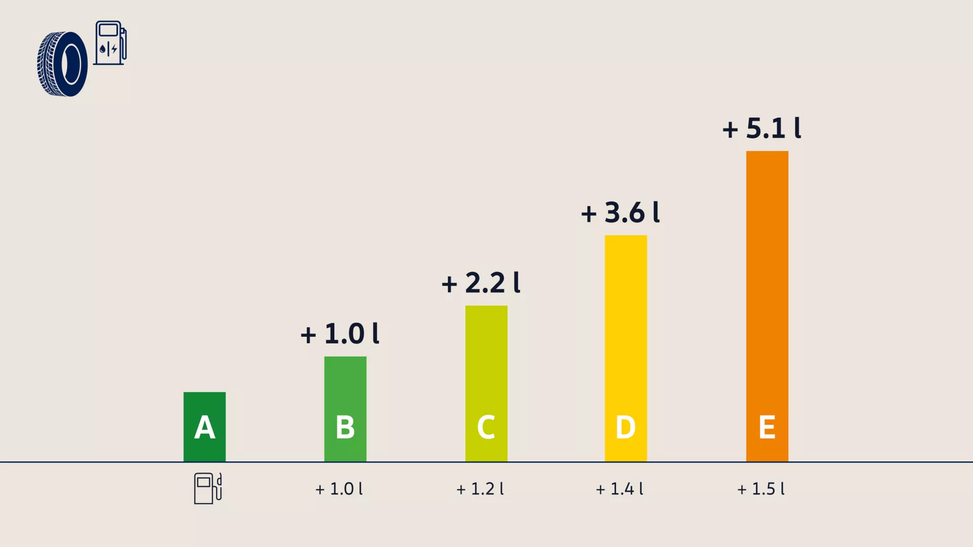 Колкото по-малко е съпротивлението на гумите при търкаляне, толкова по-малък е разходът на гориво/енергия на автомобила. При автомобил, задвижван на бензин или дизел, допълнително спестявате и няколко грама CO2. Съответно между клас А и Е на 1000 км разликата е до 5,1 л.