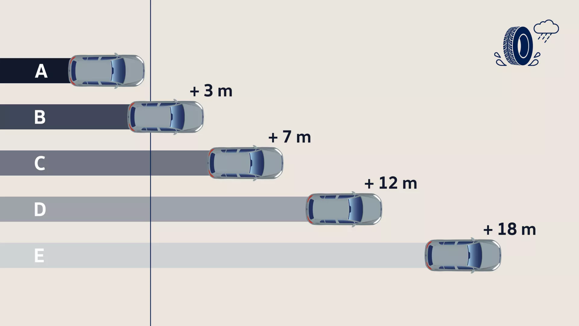 Колкото по-добро е сцеплението на гумата с влажна повърхност, толкова по-къс е спирачният път при мокра настилка. Спирачният път се удължава от един клас към следващия с 3 до 6 м при 80 км/ч.
