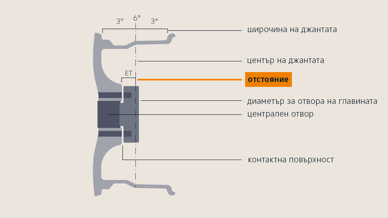 Съкращението ЕТ посочва отстоянието на джантата - колко голямо е разстоянието между контактната повърхност и осовата линия на колелото в мм. В нашия случай е 49 мм.